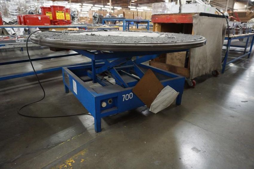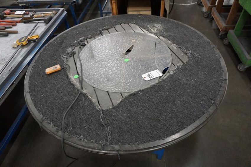 Steel Electric Lift Table Base, Rotating round Custom Table Top, Electric controller (Please Inspect, damage to Transparent Fiberglass on tabletop), Dimensions: Table Top Approx 59" Dia, Lift table footprint 36" x 36"