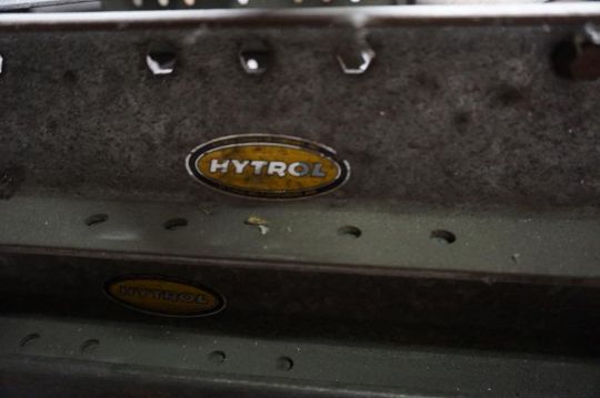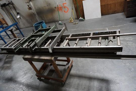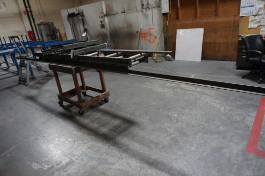 10' HYTROL Steel Roller Conveyor (Disassembled with rolling cart), Roller Dimensions: Roller 10' L x 20" D, 234" stabilization bar, (3) Sets Adjustable Legs