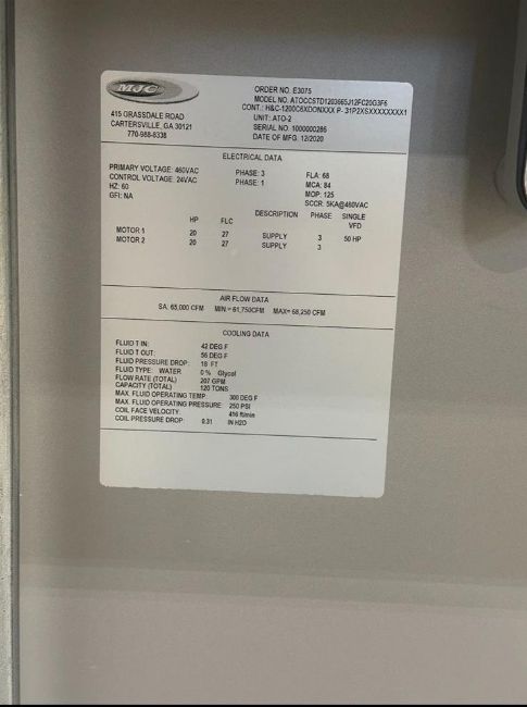 2020 MJC Air Rotation Unit, S/N: 10000000286, Air Flow Data: SA: 65,000 CFM, Min: 61,750 CFM, Max: 68,250 CFM, Max Fluid Operating Temp: 300 Deg F, Max Fluid Operating Pressure: 250 PSI, Fluid T In: 42 Deg F, Fluid T Out: 56 Deg F, 460VAC, 60Hz, 3 Phase. New Cost $220,000